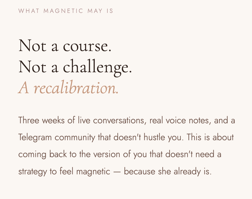 What I've come to know is this: magnetism isn't a marketing tactic. It's what's left when you stop performing. When your nervous system trusts the path. When you stop trying to become someone worth following and remember you already are.